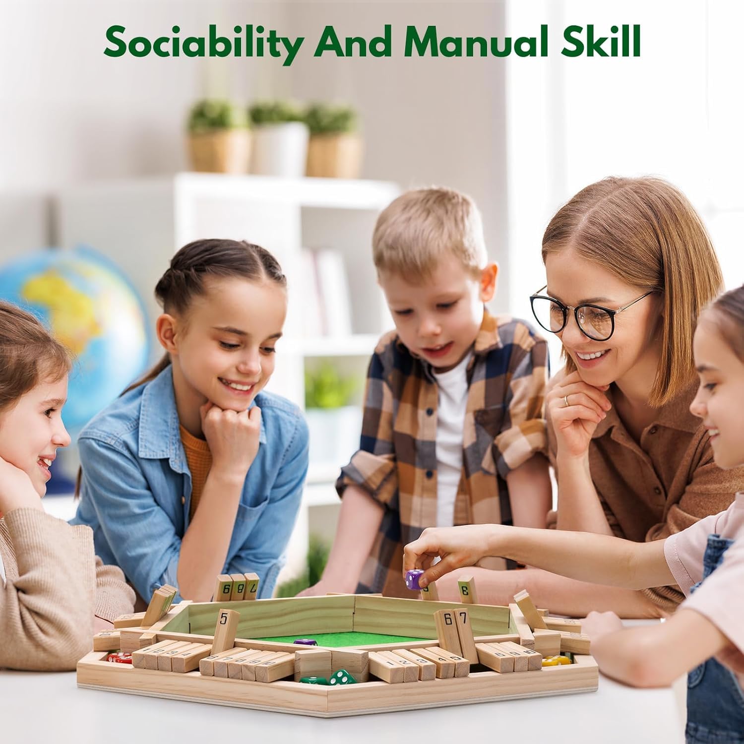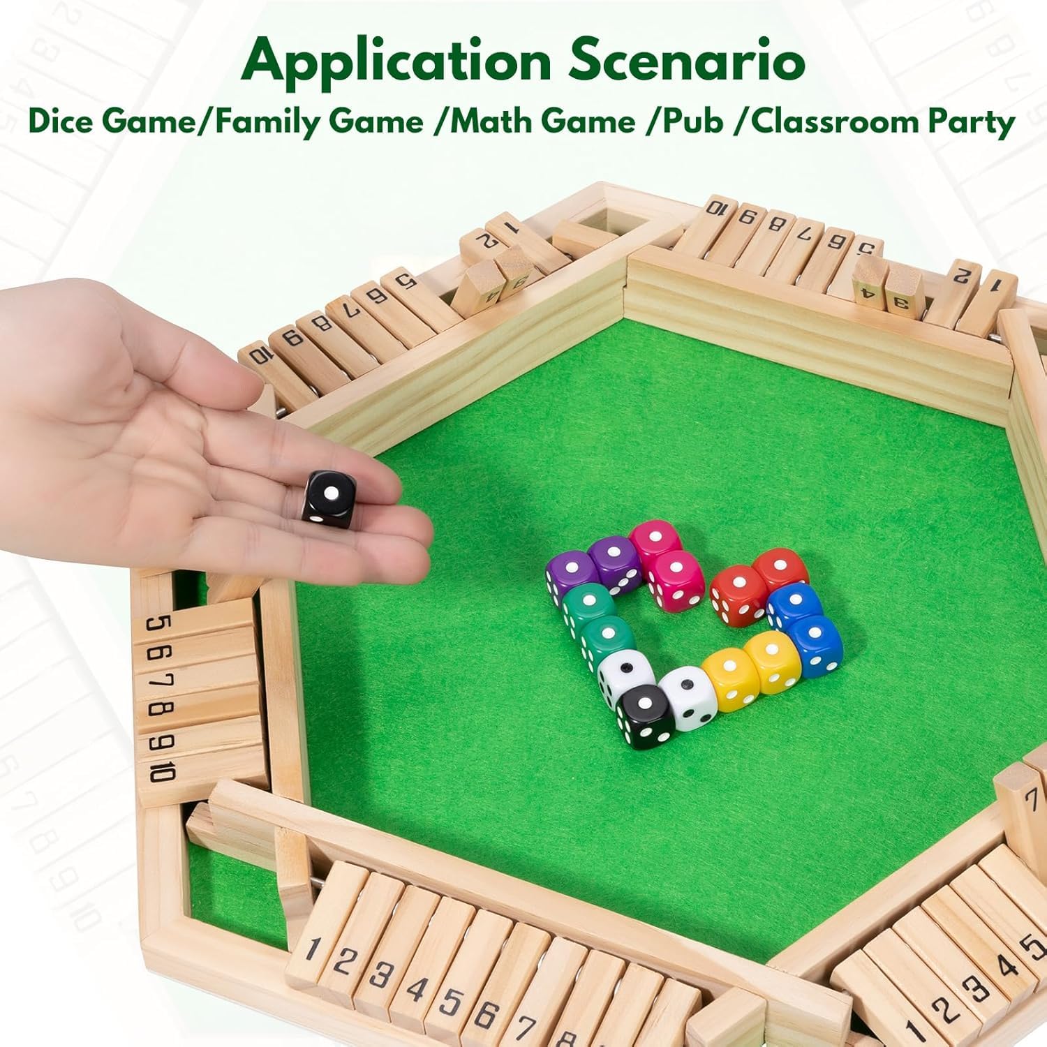 • Includes 6 sets of wooden number tiles (1–10) and 12 multi-colored dice for fast-paced group play