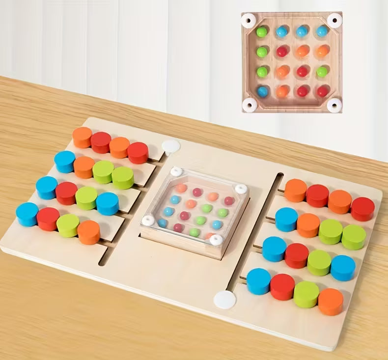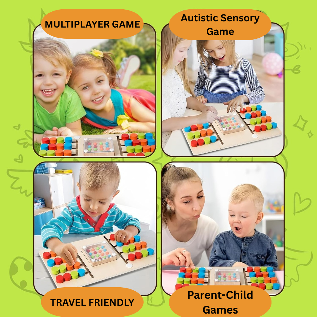 3.Match the Pattern: Both players simultaneously race to move their colored discs on their side of the board to match the pattern of the colored balls.