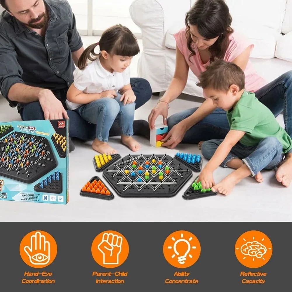 JOYCY introduces a highly engaging Geometric Triangle Strategy Board Game, designed to boost spatial intelligence, logic, and competitive thinking in a fun and creative way. This multiplayer boardvgame comes with 4 interlocking triangular PVC boards, 84 vibrant pegs, 44–47 elastic bands, and an instruction booklet in both English and Chinese. Players use colorful pegs and stretchable rubber bands to form geometric patterns, build shapes, or block opponents, creating an exciting and educational game for kids and adults alike. With its modular board setup, multiple players can join in at once, making it ideal for families, classrooms, parties, or travel fun. This game challenges visual planning, hand-eye coordination, and color strategy, all while promoting creativity and teamwork. Compact, durable, and visually appealing, it’s a perfect gift for puzzle lovers, young learners, and logical thinkers.