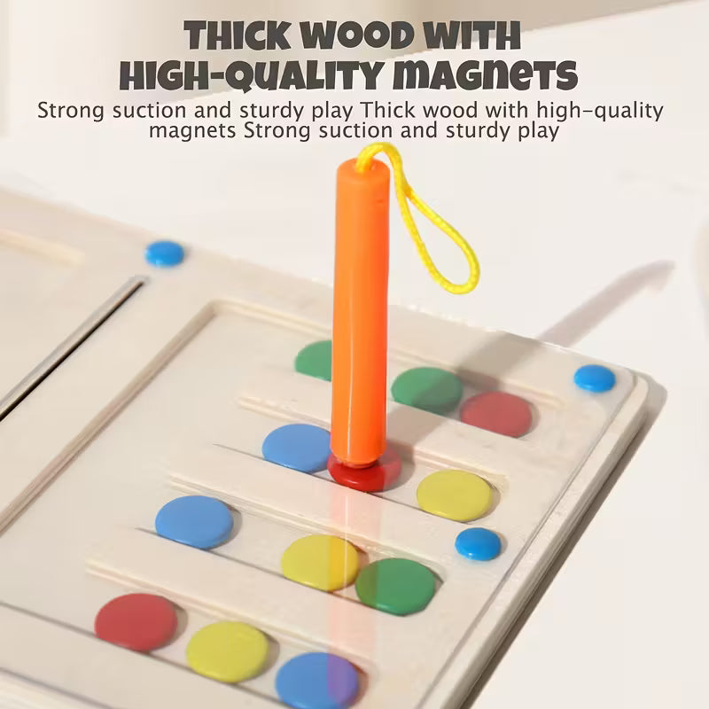 Magnetic Color-Matching Game – Use the magnetic pen to guide colored discs into place, mimicking challenge card patterns without touching with your hands.
