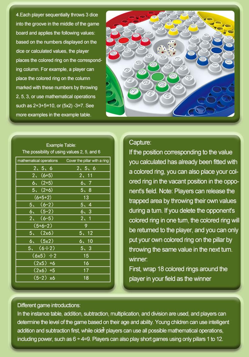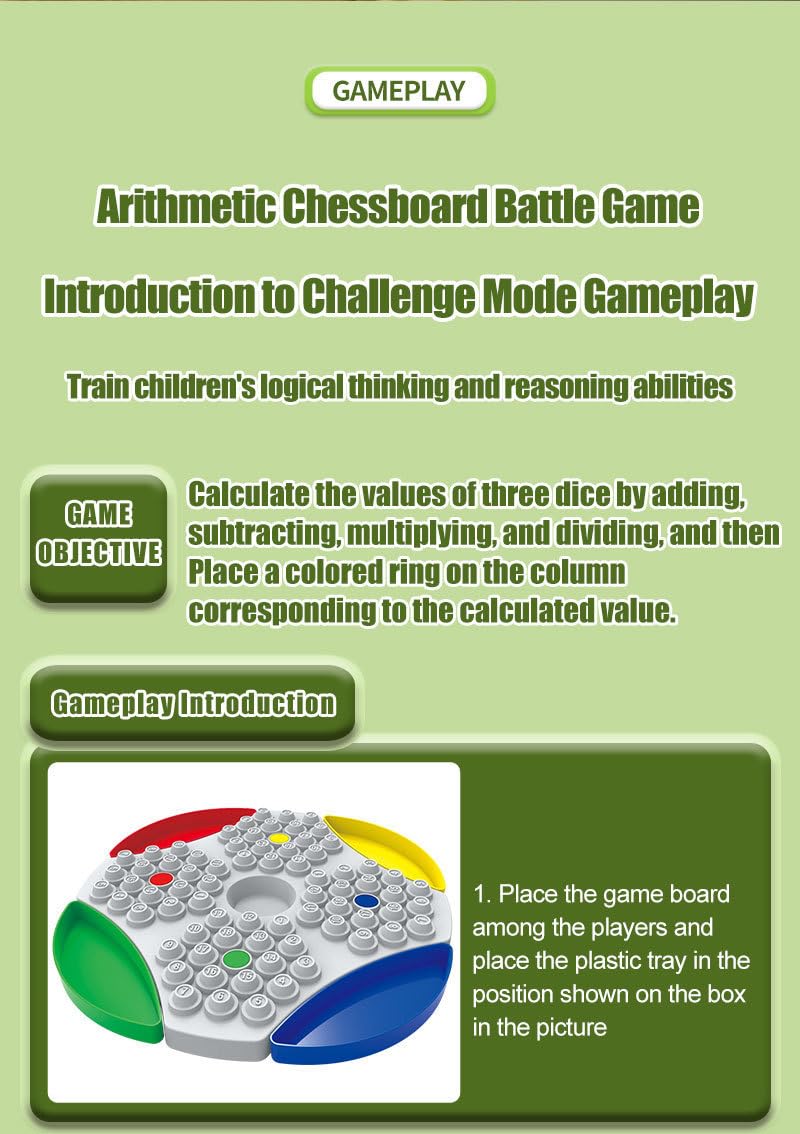 Elevate number sense and sharpen thinking with the JOYCY Math Strategy Board, an exciting multiplayer experience designed to build speed, accuracy, and focus through number-based challenges. Using dice rolls, players race to identify and cover the correct numbered slots on the board, testing their mental math and reaction skills in real time. Designed for up to four participants, this hands-on setup encourages healthy competition, number recognition, and critical thinking in a colorful and engaging format. Ideal for home learning, classroom settings, or family game nights, the JOYCY Math Strategy Board offers an active and effective way to support children's cognitive development through meaningful interaction.
