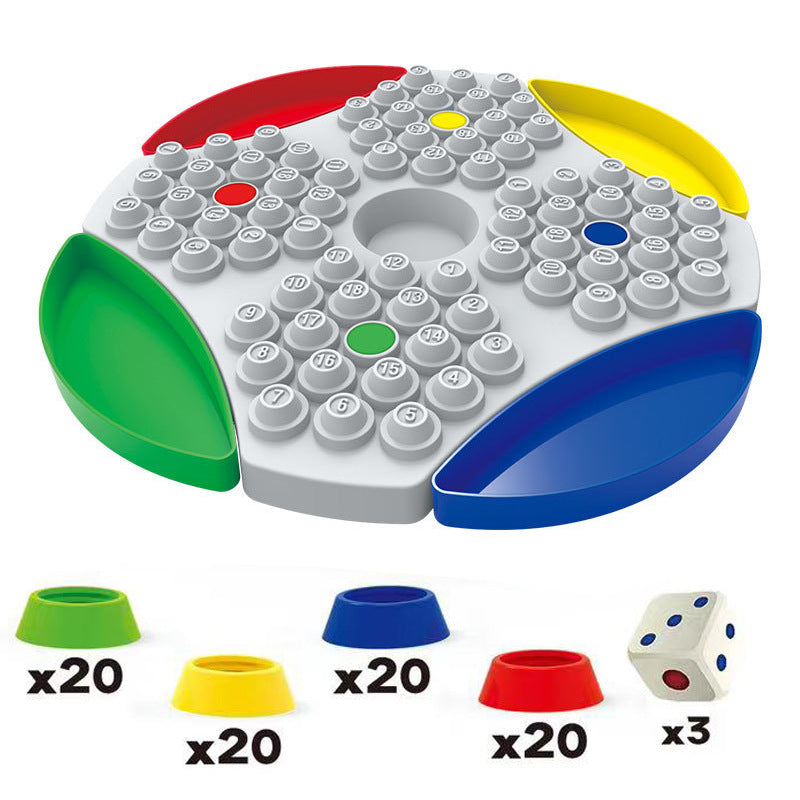 Includes colorful number pegs, central dice area, and four distinct player zones for organized play.